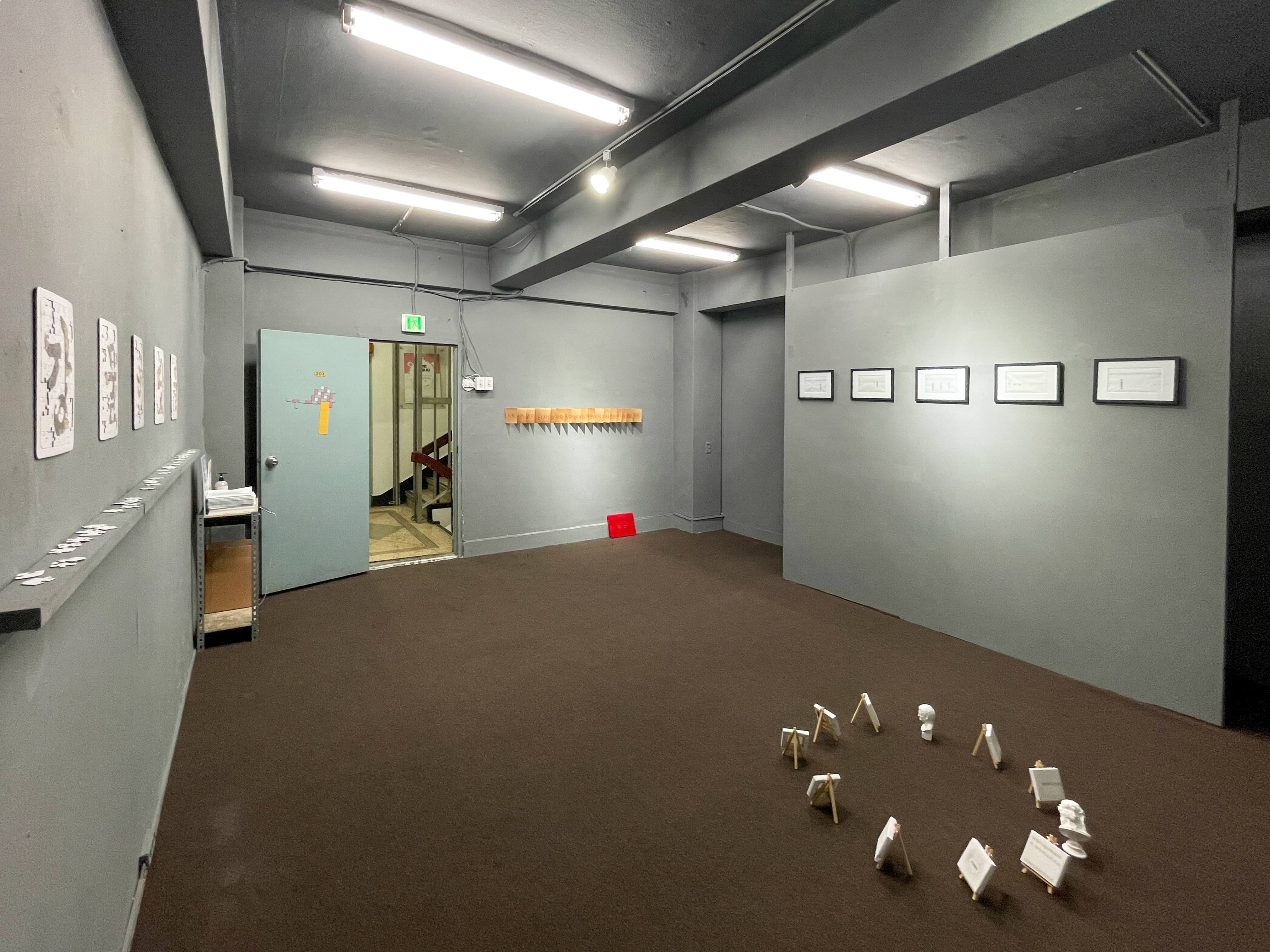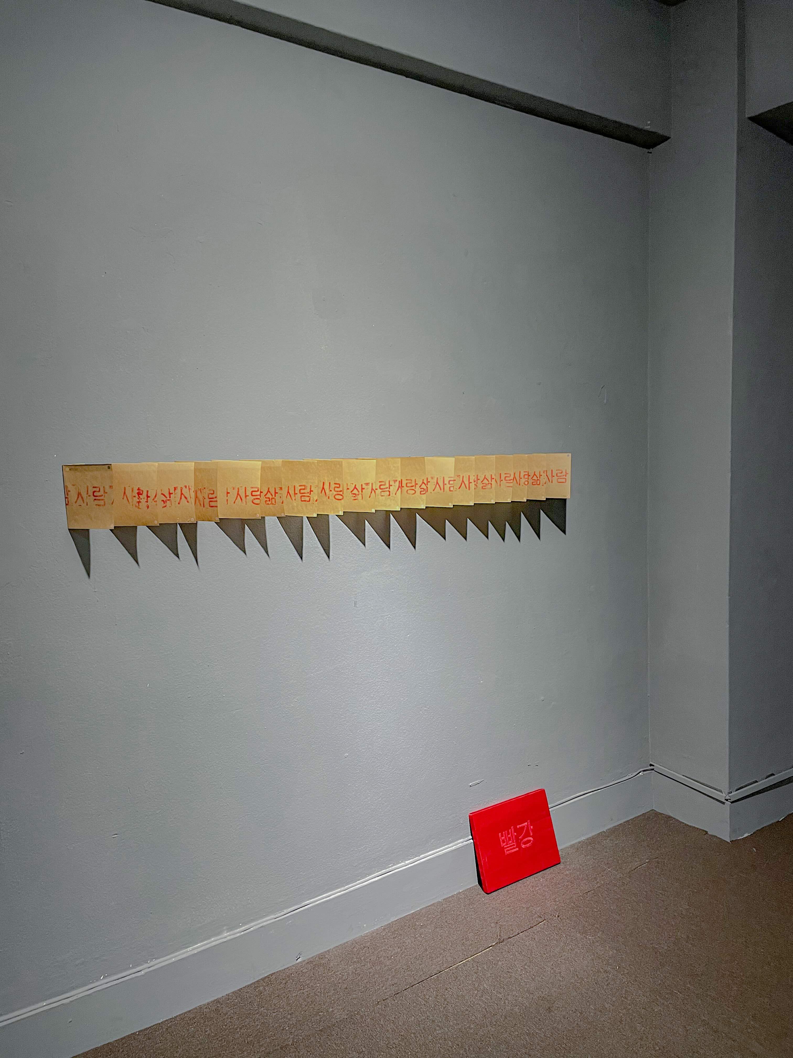 ‘강물’조각은 색칠을 하고 ‘바닷물’ 조각은 종이를 뜯어내어 퍼즐을 완성합니다. 그리고 ‘강물’과 ‘바닷물’의 몇조각을 서로 교환 합니다. 강물과 바닷물의 경계는 ‘물’이라는 하나의 속성과는 무관하게 언어적으로 구분되어 있습니다. 우리는 퍼즐이 섞여 있 음에도 어렴풋이 ‘강물’과 ‘바닷물’을 읽어낼 수 있음을 시각적으로 표현한 작품입니다. 언어의 세계에서 이쪽과 저쪽의 완벽한 경계는 불가능합니다. 맥락은 이야기와 이야기 사이에서 의존적으로 발생하고, 뜻은 말하기 방식에 따라 달라집니다. 그래서 의미는 늘 조금 애매하게 다른 단어에 걸쳐진 상태로 있음에도 우리는 그것을 안다고, 이해한다고 말하고 있는 것은 아닐까요?